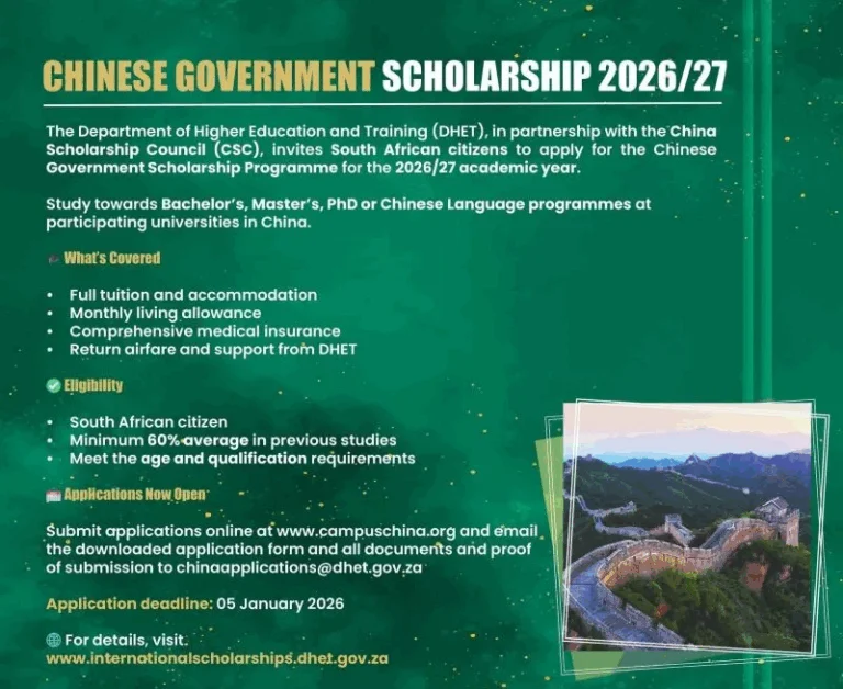 Applications are open for the Chinese Government Scholarship 2026/2027 for South Africans. The Department of Higher Education and Training (DHET), in partnership with the China Scholarship Council (CSC), invites South African citizens to apply for the Chinese Government Scholarship for the 2026/27 academic year.