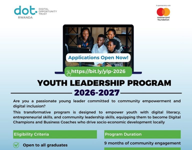 Are you a passionate young leader committed to community empowerment and digital inclusion? Join the Movement! Digital Opportunity Trust (DOT) Rwanda, under the Digital Skills for Employability (DSE) program, in partnership with the Mastercard Foundation, is proud to announce that applications are now open for the Youth Leadership Program 2026-2027.