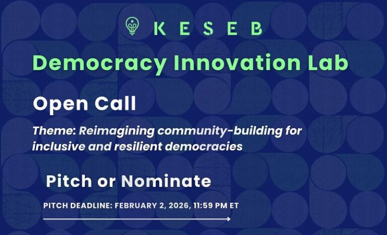 Applications are open for the Keseb Democracy Innovation Lab 2026. Keseb’s Democracy Innovation Lab catalyzes promising early-stage innovations reimagining the building blocks of democracy. The theme of the inaugural iLab is “reimagining community-building for inclusive and resilient democracies.” They are seeking to select and support 10 innovative community-building solutions that aim to foster cross-group belonging in diverse societies.